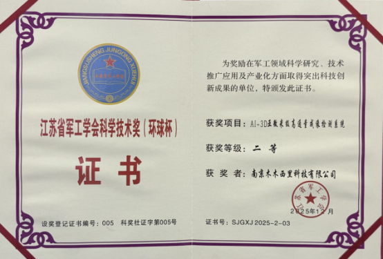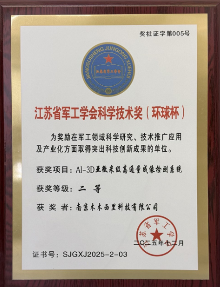 近日,江苏省军工协会发布2025年江苏省军工学会科学技术奖(环球杯)评审结果,我司“AI-3D亚微米级高通量成像检测系统”荣获二等奖!